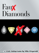 Faux Diamonds is a 4-suit trick-taking game in which players sell their cards (diamonds) on value tracks that change after each sale. After a series of hands, the winner is the player who has accumulated the most wealth.