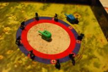 The box lid serves as a second board where figures representing guards are placed. A player who is raiding a concentration camp then uses the dreidel to knock over and kill guards. This leads to freeing prisoners from the camp.