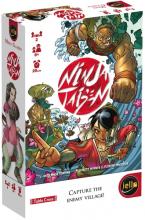 Ninja Taisen is a two-player, dice-driven open information abstract game with a random set-up. Both players have identical sets of ten fighters, with three fighters in each of three colors with values 1–3 along with a tri-colored boss valued at 4; these fighters are placed in small stacks of varying size onto a line that's eleven steps long. On a player's turn, he rolls the three colored dice and can make up to three moves accordingly, with the blue die moving a blue fighter, etc. Moving a fighter that has other fighters on top of him moves these other fighters as well.